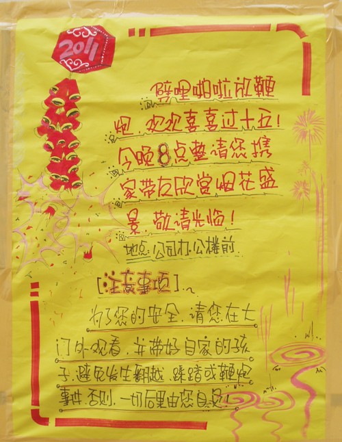 2月17日訊(辦公室 高慧)又是一年元宵至??椿?、放焰火已成了點(diǎn)綴節(jié)日氣氛的傳統(tǒng)節(jié)目。農(nóng)歷正月十五晚8時(shí),公司辦公樓前人頭攢動(dòng),隨著一聲炮響,“開門紅”、“好運(yùn)來”、“笛聲牡丹”、“步步高升”……各式禮花在空中絢爛綻放,似漫天飛瀑、像梨花綻放、又如銀蛇狂舞……好一個(gè)火樹銀花不夜天!祝愿公司的明天也如這美麗的煙花輝煌絢爛!